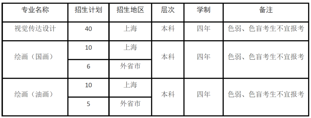 注:在外省市招生的具体计划详见2023年各省招生办公室公布的招生专业目录。 四、专业考试 专业考试成绩采用考生所在省、市组织的美术与设计学类专业统一考试成绩,学校不再加试。 五、录取原则 以院校正式公布的2023年招生章程为准。 六、联系方式 学校咨询电话:021-38284395 学校监督电话:021-38284080 学校招生网址:http://admission.shmtu.edu.cn 学校地址:浦东新区临港新城海港大道1550号 邮政编码:201306