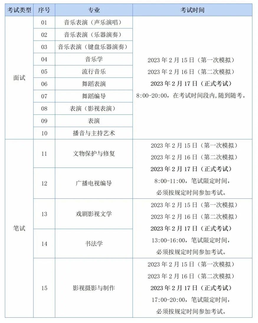 一、考试日期 (一)考前练习时间 考生请于2023年2月11日(周六)9:00起登录小艺帮APP【确认报考】栏目进行考试确认。考前练习至正式考试前,无次数限制。 注意:此日期前系统不开放,无法进行考前练习。 (二)模拟考试日期 第一次模拟考试:2023年2月15日(周三) 第二次模拟考试:2023年2月16日(周四) 模拟考试具体科目时间与正式考试时间一致。 (三)正式考试日期 2023年2月17日(周五) 二、具体考试时间安排 三、考试内容