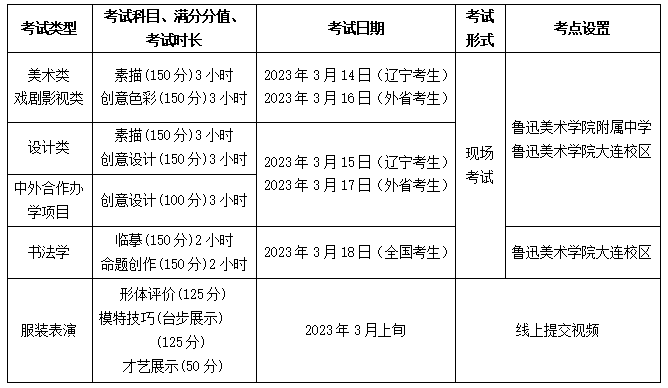 (一)“美术类”、“戏剧影视类”、“设计类”、“中外合作办学项目”初选通过的考生,可根据个人意愿及考点容量安排,选择在鲁迅美术学院附属中学或鲁迅美术学院大连校区进行现场考试; (二)报考“书法学”的考生,现场考试在鲁迅美术学院大连校区进行; (三)考点地址:鲁迅美术学院附属中学:辽宁省沈阳市大东区望花中街146号 鲁迅美术学院大连校区:辽宁省大连市金普新区金石滩金石路39号 (四)“服装表演”考试具体要求后续公告。 二、初选结果查询 已报名的“美术类”、“戏剧影视类”、“设计类”、“中外合作办学项目”考生,请于2023年2月18日15:00-2023年2月22日24:00登录我校本科招生专业考试报名管理系统https://user.artstudent.cn/login/10178.htm在“专业成绩/结论”中查看初选结果,或使用“艺术升”手机APP点击“成绩查询”查看初选结果,初选通过的考生,进行选择考点、专业填报、缴费确认等操作。 三、专业填报和缴费确认 已通过“美术类”、“戏剧影视类”、“设计类”、“中外合作办学项目”初选的考生,须在2023年2月18日15:00-2023年2月22日24:00进行专业填报和缴费确认等操作,逾期不予补报和修改报考信息。 (一)操作流程 登录报名系统→选择艺术院校校考报名→选择鲁迅美术学院→选择考点→选择考试类型→点击“志愿填报”进行专业填报→最终确认提交→选择支付宝缴费→在“已报专业”查询报名状态→显示报名成功即为报考成功。 (缴费成功即视为确认参加考试。未上传报考资料的考生,须在支付成功24小时内上传考生照片、身份证等报考资料。考生可在考试前1天通过电脑网页端自行打印《专业考试准考证》。) (二)专业填报说明 今年,我校调整了招考办法,即按“考试类型”组织专业考试,按“招生专业”进行校考合格证发放和录取。考生应认真阅读和理解《鲁迅美术学院2023年本科招生简章》中所述的招考办法及录取原则,进行合理填报。 专业填报时,“美术类”、“戏剧影视类”、“设计类”初选合格考生须在本人合格类型所含的专业中选择1-3个填报;“中外合作办学项目”初选合格考生须在该类型所含专业中选择1-2个填报。我校按专业发放校考合格证,考生若填报多个专业,填报的各专业无先后顺序区别,即“美术类”、“戏剧影视类”、“设计类”考生最多可拿到3个专业的校考合格证,“中外合作办学项目”考生最多可拿到2个专业的校考合格证。 *因陕西省、湖北省对“戏剧影视导演”专业省统考科类有不同要求,陕西省、湖北省考生不能报考我校“戏剧影视导演”专业。 (三)注意事项 初选通过的考生务必在规定时间内完成专业填报和缴费确认流程,并在“交费记录”中查看是否支付成功,未按规定流程报名缴费或报考手续不全的不得参加考试,因考生本人疏漏或失误造成的后果,由考生本人承担责任。