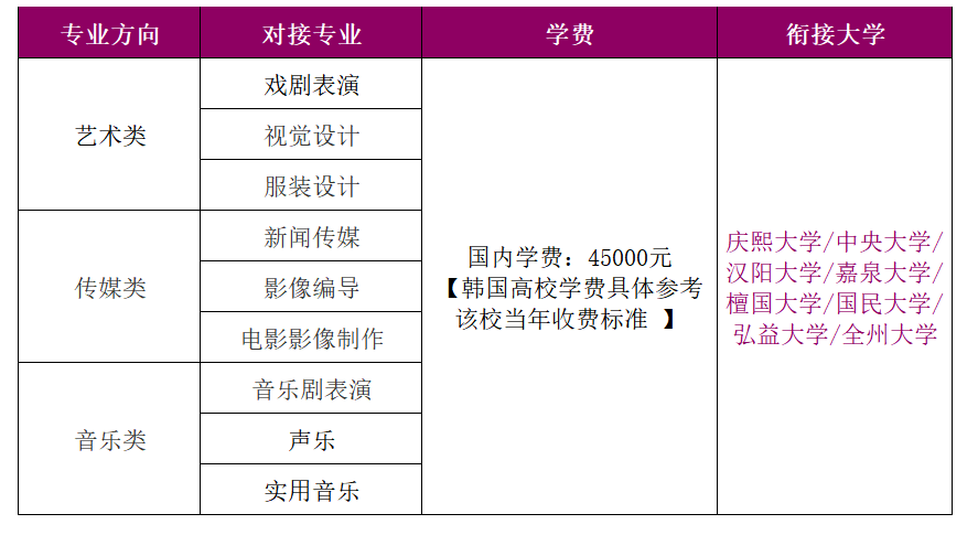 【备注:国内课程设置:韩语语言+专业课程 ;学习时间:每年8月底或9月初至次年5月,经考试合格升入韩国对应大学】