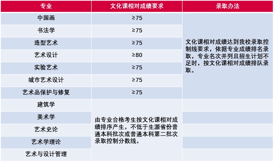 1)造型艺术、中国画、书法学、实验艺术、城市艺术设计、艺术品保护与修复专业文化课相对成绩线为75分;